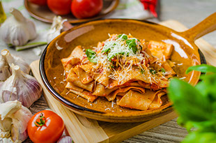 Sauteed chicken in a zesty pink sauce made with prosciutto, carmalized onions & penne pasta